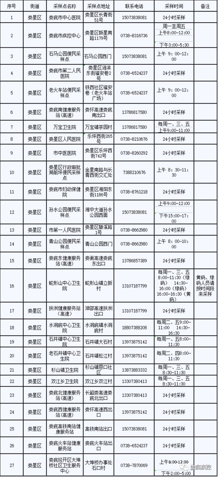 婁底市常態(tài)化核酸檢測(cè)采樣點(diǎn)信息公布一覽表