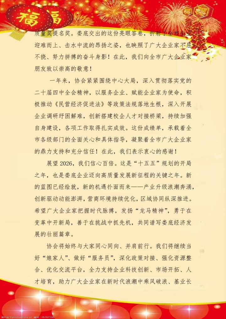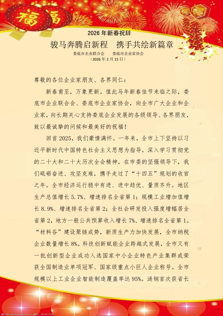 婁底市企業(yè)聯(lián)合會(huì)、婁底市企業(yè)家協(xié)會(huì)2026年新春祝辭