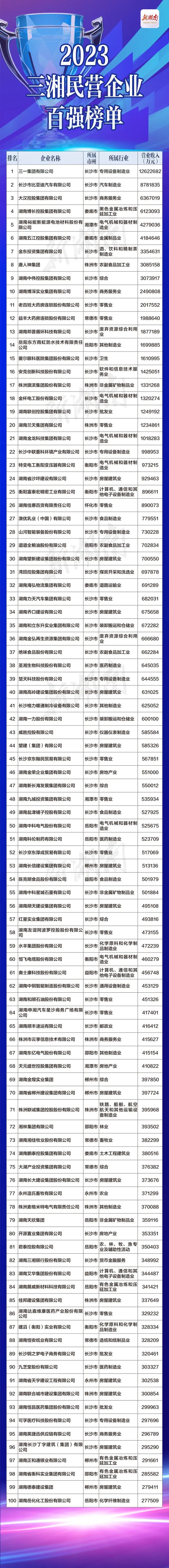 “全球工程機(jī)械50強(qiáng)”中,湖南民營企業(yè)占據(jù)3席;裕能新能源、唐人神等2家企業(yè)新入圍全國民營企業(yè)500強(qiáng)。