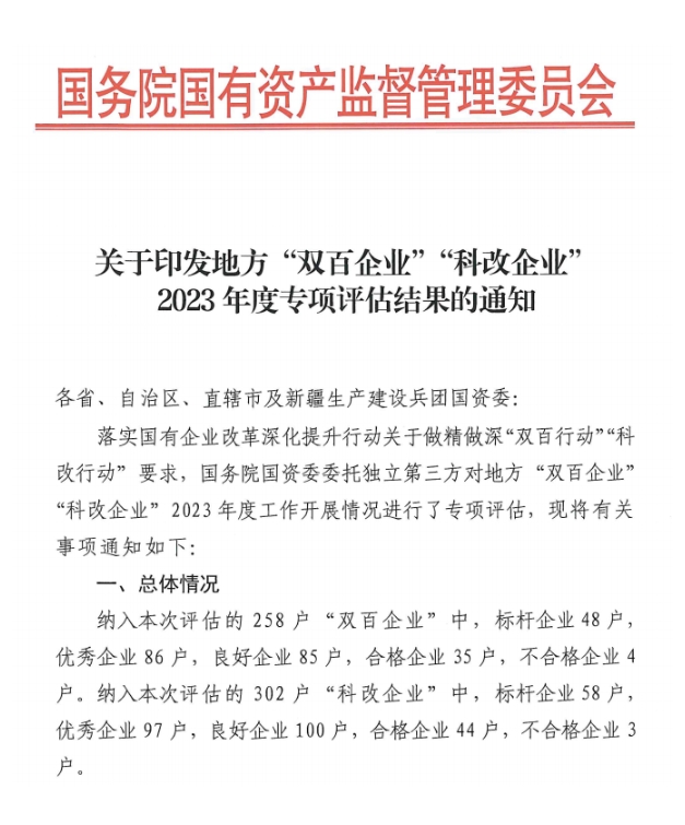 據(jù)了解,“科改企業(yè)”專項(xiàng)評(píng)估每年進(jìn)行一次,旨在落實(shí)國(guó)有企業(yè)改革深化提升行動(dòng)關(guān)于做精做深“科改行動(dòng)”要求。本次國(guó)務(wù)院國(guó)資委委托獨(dú)立第三方對(duì)地方“科改企業(yè)”2023年度工作開(kāi)展情況進(jìn)行了專項(xiàng)評(píng)估,考核結(jié)果按照得分高低分為標(biāo)桿、優(yōu)秀、良好、合格、不合格五個(gè)等級(jí),考核內(nèi)容涉及企業(yè)科技創(chuàng)新、體制機(jī)制、綜合成效等方面共計(jì)47項(xiàng)指標(biāo),全面權(quán)威地反應(yīng)了企業(yè)在加快科技新成果轉(zhuǎn)化、提升自主創(chuàng)新能力等方面的舉措和成果。