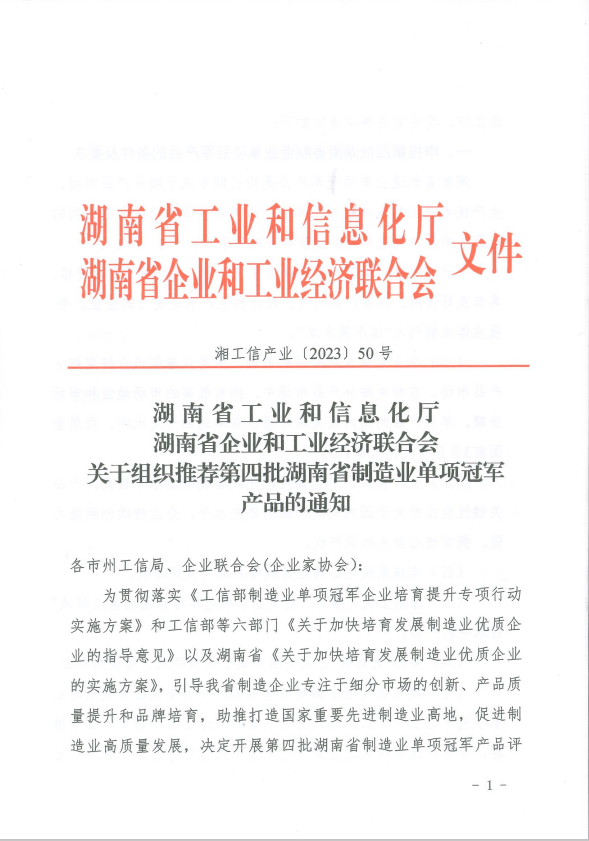 關(guān)于組織推薦第四批湖南省制造業(yè)單項(xiàng)冠軍產(chǎn)品的通知