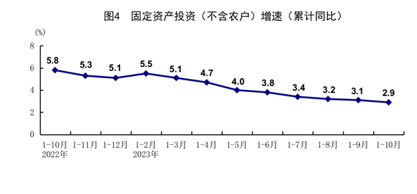 1-10月份,全國固定資產(chǎn)投資(不含農(nóng)戶)419409億元,同比增長2.9%,比1-9月份回落0.2個百分點。分領(lǐng)域看,基礎(chǔ)設(shè)施投資同比增長5.9%,制造業(yè)投資增長6.2%,房地產(chǎn)開發(fā)投資下降9.3%。全國商品房銷售面積92579萬平方米,同比下降7.8%;商品房銷售額97161億元,下降4.9%。分產(chǎn)業(yè)看,第一產(chǎn)業(yè)投資同比下降1.3%,第二產(chǎn)業(yè)投資增長9.0%,第三產(chǎn)業(yè)投資增長0.4%。民間投資下降0.5%,降幅比1-9月份收窄0.1個百分點;扣除房地產(chǎn)開發(fā)投資,民間投資同比增長9.1%。高技術(shù)產(chǎn)業(yè)投資同比增長11.1%,其中高技術(shù)制造業(yè)和高技術(shù)服務(wù)業(yè)投資分別增長11.3%、10.5%。高技術(shù)制造業(yè)中,航空、航天器及設(shè)備制造業(yè),醫(yī)療儀器設(shè)備及儀器儀表制造業(yè)投資分別增長19.0%、16.7%;高技術(shù)服務(wù)業(yè)中,科技成果轉(zhuǎn)化服務(wù)業(yè)、專業(yè)技術(shù)服務(wù)業(yè)投資分別增長37.3%29.1%。10月份,固定資產(chǎn)投資(不含農(nóng)戶)環(huán)比增長0.10%