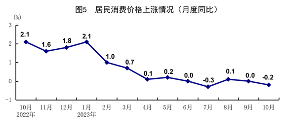10月份,全國居民消費價格(CPI)同比下降0.2%,環(huán)比下降0.1%。分類別看,食品煙酒價格同比下降2.1%,衣著價格上漲1.1%,居住價格上漲0.3%,生活用品及服務(wù)價格下降0.6%,交通通信價格下降0.9%,教育文化娛樂價格上漲2.3%,醫(yī)療保健價格上漲1.3%,其他用品及服務(wù)價格上漲3.6%。在食品煙酒價格中,豬肉價格下降30.1%,鮮菜價格下降3.8%,糧食價格上漲0.6%,鮮果價格上漲2.2%。扣除食品和能源價格后的核心CPI同比上漲0.6%。1-10月份,全國居民消費價格同比上漲0.4%。